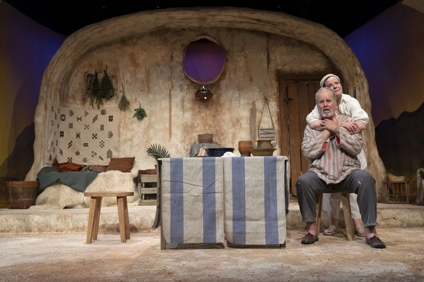 Ken Cheeseman and Catherine Lloyd Burns in the premiere of Will Sacrifice by Julie McKee at Chester Theater Co. Set by Travis George; Lights by Lara Dubin; projections by Matthew Whitall; sound by Dave Wiggall; costumes by Deborah Brothers.